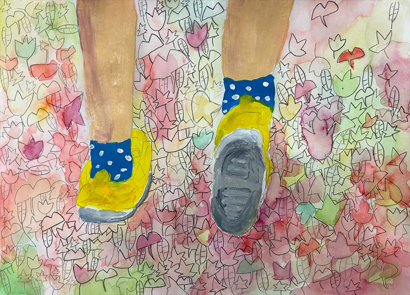 秋になると、足元にある落ち葉を踏んで音を楽しんでいたので、この風景にしました。