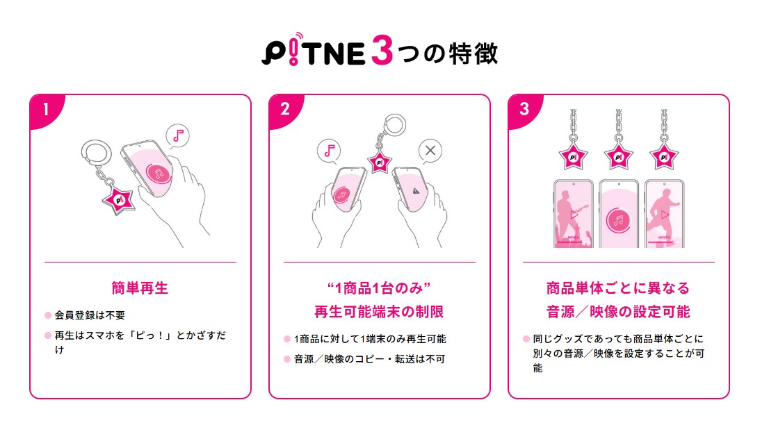 「P!TNE」は、NFC(Near Field Communication:近距離無線通信)技術を活用し、グッズとデジタルコンテンツ(音、楽曲、ボイス、映像など)を組み合わせることを可能とした、新しいエンタメ体験をお届けするファングッズソリューションです。NFCタグを設定したグッズにスマホをかざすことで、「P!TNE」アプリから設定したコンテンツが流れる仕組みとなっています。