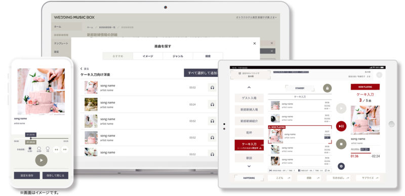 2,300万曲以上※2の邦楽、洋楽、K-POP、JAZZ、クラシック、インストゥルメンタルまで幅広いジャンルの楽曲から、新郎新婦の希望にあった楽曲を各シーンのBGMに簡単に選曲・設定が可能です。